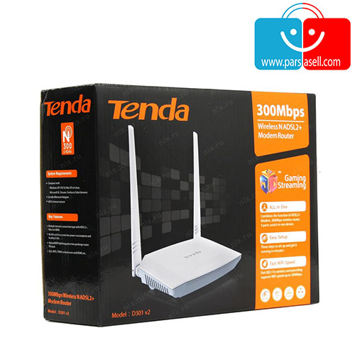 مودم روتر «D301v2» محصولی از برند «تندا» (Tenda) است. این محصول میتواند در نقش چند دستگاهِ کاربردی شبکه انجاموظیفه کند و نقش یک مودم و روتر باسیم و بیسیم را بر عهده داشته باشد. با این دستگاه میتوانید یک مودم ADSL2+، یک روتر بیسیم و یک سوییچ چهار پورت را در یک محصول در اختیار داشته باشید. داشتن قابلیتهایی همچون USB Sharing ،IPTV، نصب آسان و TR069 بر ارزش این محصول افزوده است. مودم روتر D301v2 از استاندارد بیسیم IEEE 802.11n پشتیبانی میکند و سرعت انتقال بیسیم تا 300 مگابیت بر ثانیه را به همراه میآورد. این پهنای باند برای دسترسی بسیار سریع به اینترنت، تماشای ویدئوی آنلاین، استفاده از سرویسهای استریمینگ، بازیهای آنلاین و اشتراکگذاری فایل کاملا جوابگوست. شبکهی بیسیم این مودم توسط 2 عدد آنتن خارجی با قدرت 5dBi ایجاد میشود و میتواند تمام مساحت یک منزل مسکونی را پوشش دهد. مودم D301v2 با در اختیار داشتن فناوری MIMO از بازتابهای سیگنال بیسیم برای کاهش نقاط کور بیسیم استفاده میکند و عملکرد بهتر شبکهی بیسیم، نرخ انتقال خوب، پایداری سیگنال و پوششدهی بالا را به همراه میآورد. در پشت دستگاه، یک پورت USB 2.0 وجود دارد که امکان اتصال فلشمموری یا هارد اکسترنال به D301v2 را فراهم میکند. با استفاده از این پورت میتوانید فایلهای موجود در حافظهی جانبی را درون شبکه و با کاربران حاضر در شبکهی بیسیم به اشتراک بگذارید. این مودم روتر در برابر صاعقه هم مقاوم است و میتواند ولتاژی تا 6000 ولت را تحمل کند. مقاومت D301v2 در برابر صاعقه، آن را برای استفاده در مناطقی که دچار صاعقههای مکرر میشود، مناسب کرده است.