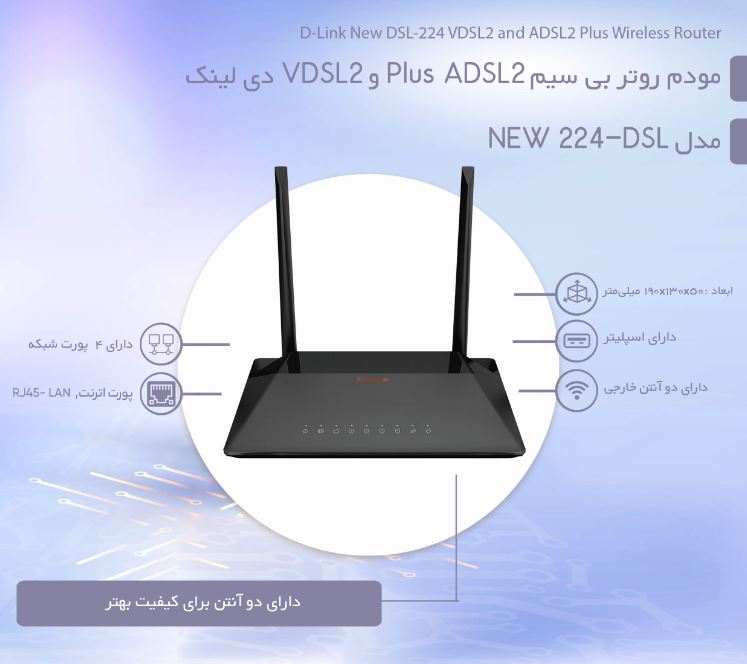 همانطور که میدانید نام دی لینک نامی آشنا در زمینه تولید سختافزار شبکه است و توانسته تا اعتماد مشتریان خود را جلب کند. در بین این تجهیزات شاید مودم دی لینک بیش از بقیه شناخته شده باشد. مودم بیسیم ADSL2 Plus و VDSL2 دی لینک مدل DSL-224 درواقع یک مودم روتر ADSL2 و VDSL است که میتواند سرعت بسیار بالایی رو در اختیار شما قرار بدهد. البته نباید این نکته را فراموش کرد که برای تجربه بهتر سرعت اینترنت باید شرکت خدمات دهنده اینترنت شما (ISP) توانایی ارائه اینترنت VDSL را داشته باشد تا مودم DSL-224 نهایت کارکرد خود را نمایش دهد. همچنین این مودم انتخابی هوشمندانه برای خانهها و دفاتر شما میباشد.