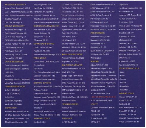 شامل نسخه نهایی برنامه های کاربردی و عمومی از قبیل آنتی ویروس و فشرده سازی و مدیریت دانلود منیجر و آفیس و فتوشاپ و پی دی اف و دیکشرنی و ...... می باشد